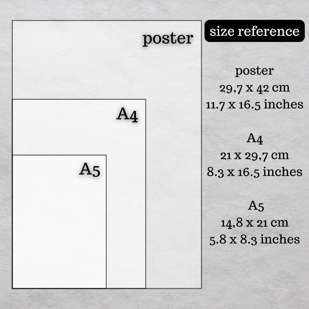 Available as A5, A4 or poster sized, unframed. All home printed on demand on 250 grams paper with a semi-matte finish. Colours may vary because of screen settings.