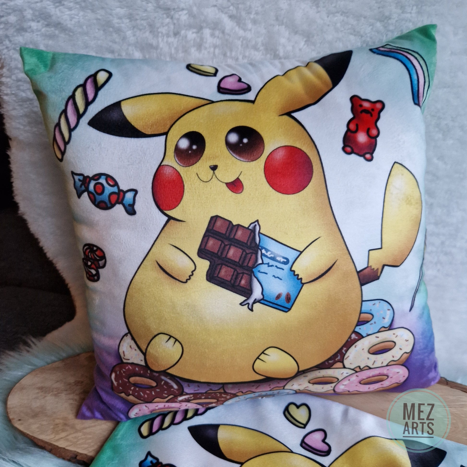 Soft and vibrant pillowcase of Chunkachu! This jolly, fat Pikachu enjoys it's candy! The colorful print double sided.