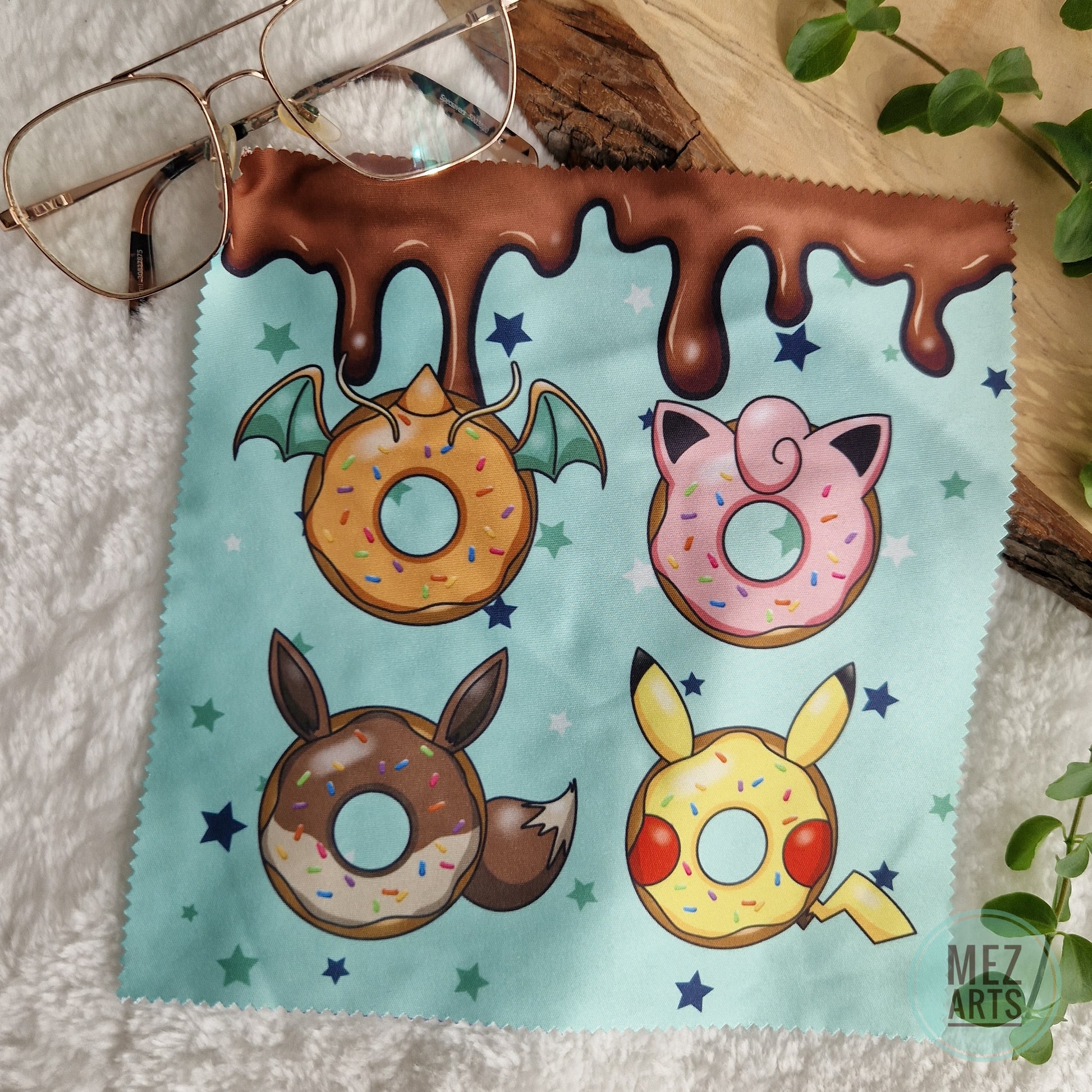 Clean your glasses, phone or tablet in style with this vibrant glasses cloth of donuts of Pikachu, Eevee, Jigglypuff and Dragonite.