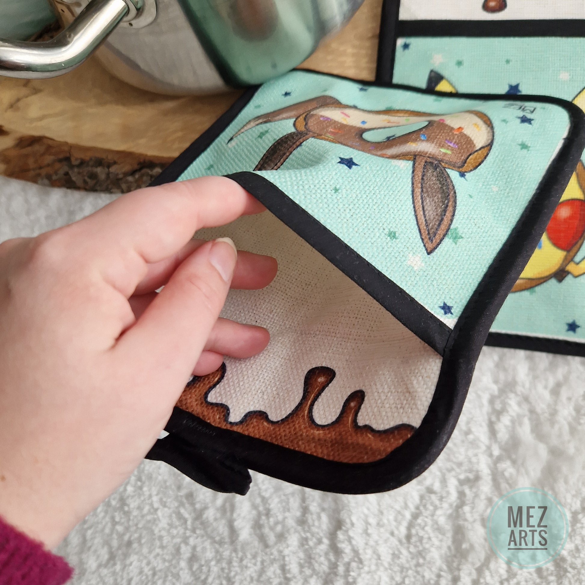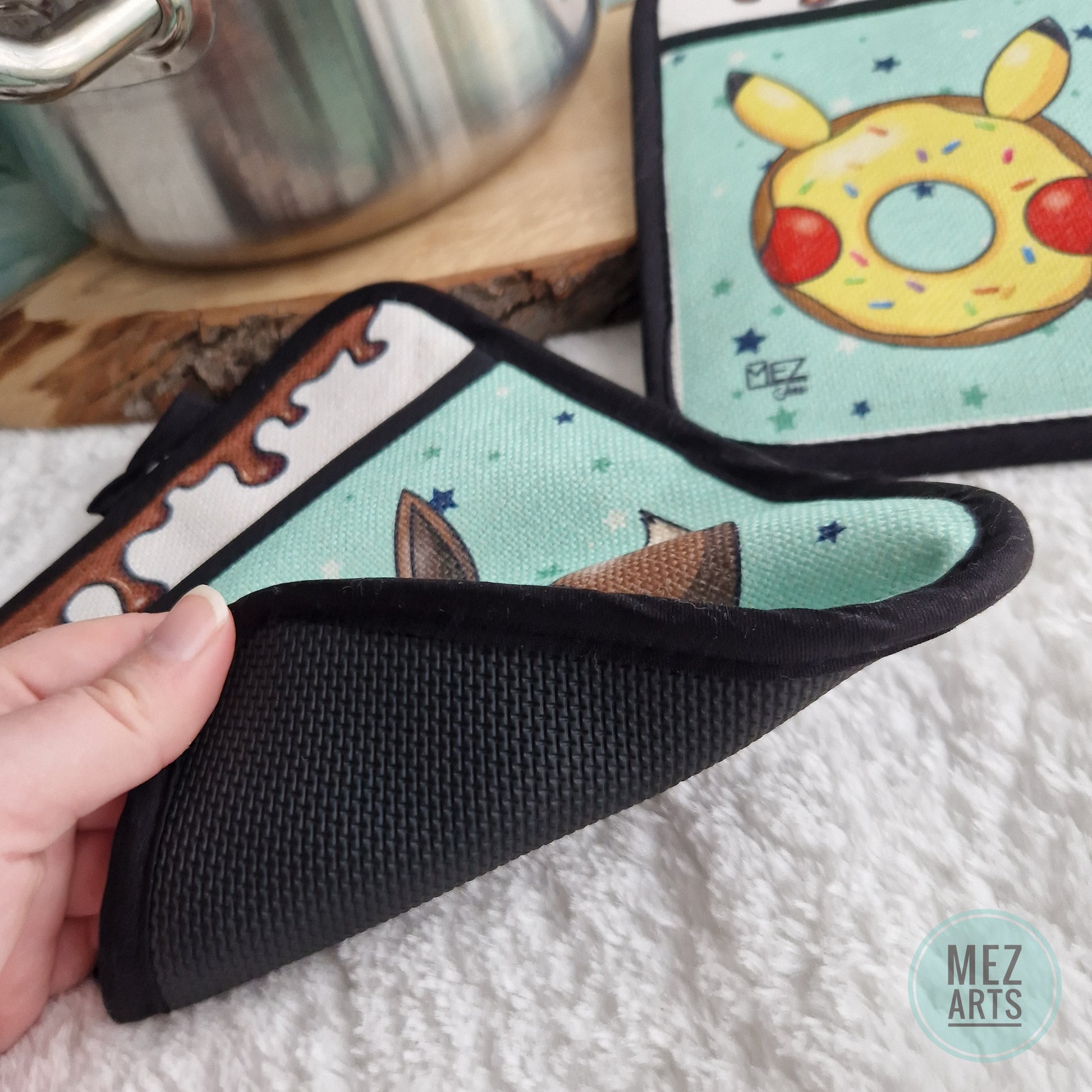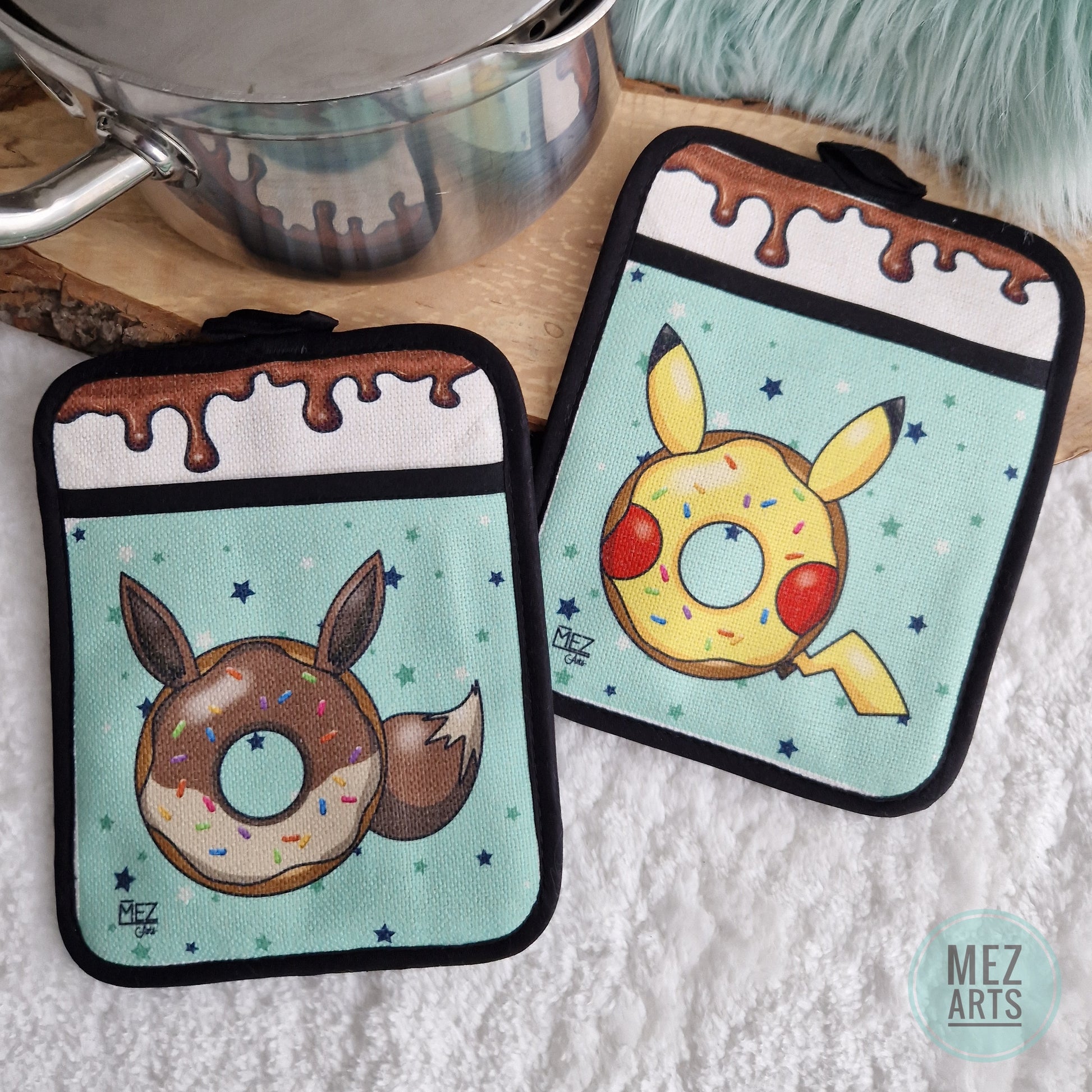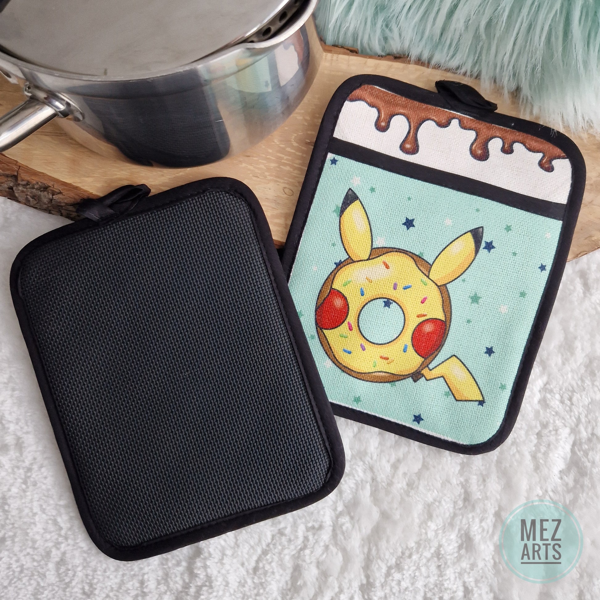 Gotta bake 'em all with these vibrant pot holders! The pikachu and eevee donut design is sublimated in the polylinnen canvas and the back has a nice antislip rubber finish.