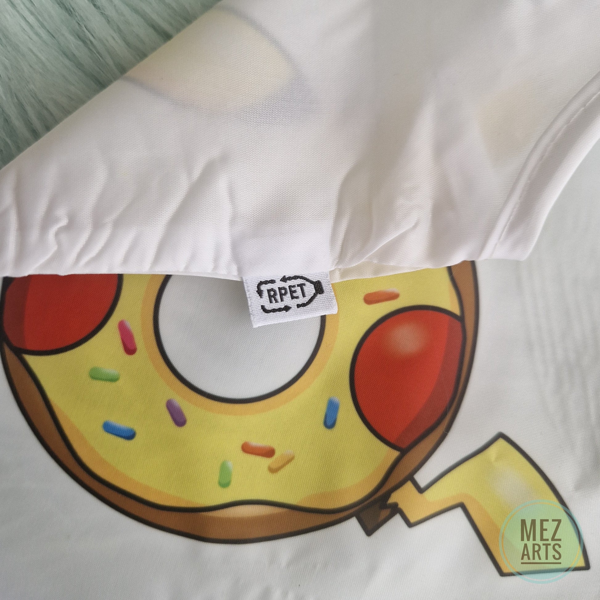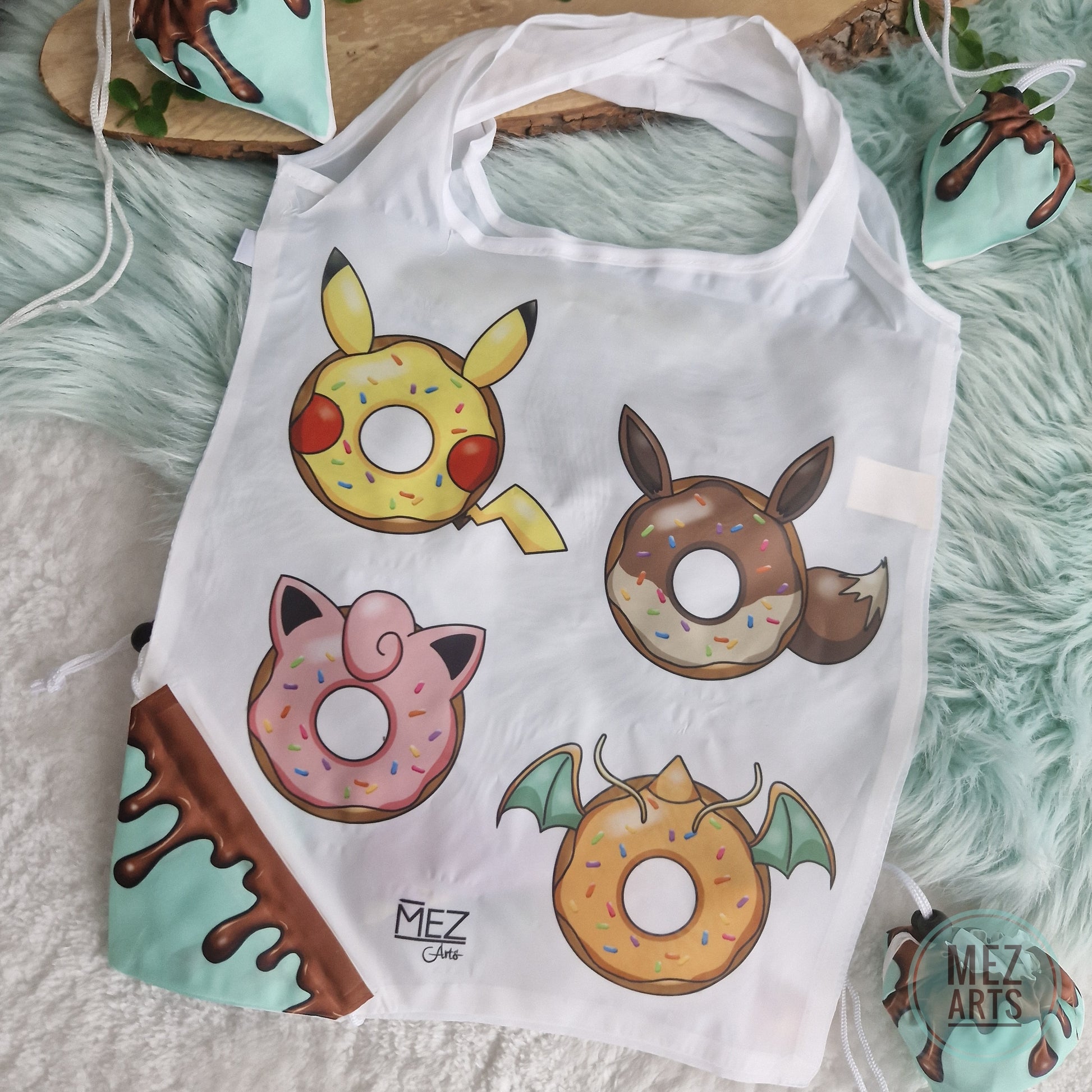 White foldable shoppingbag with a big and vibrant sublimated prints of Pikachu, Eevee, Jigglypuff and Dragonite donuts.