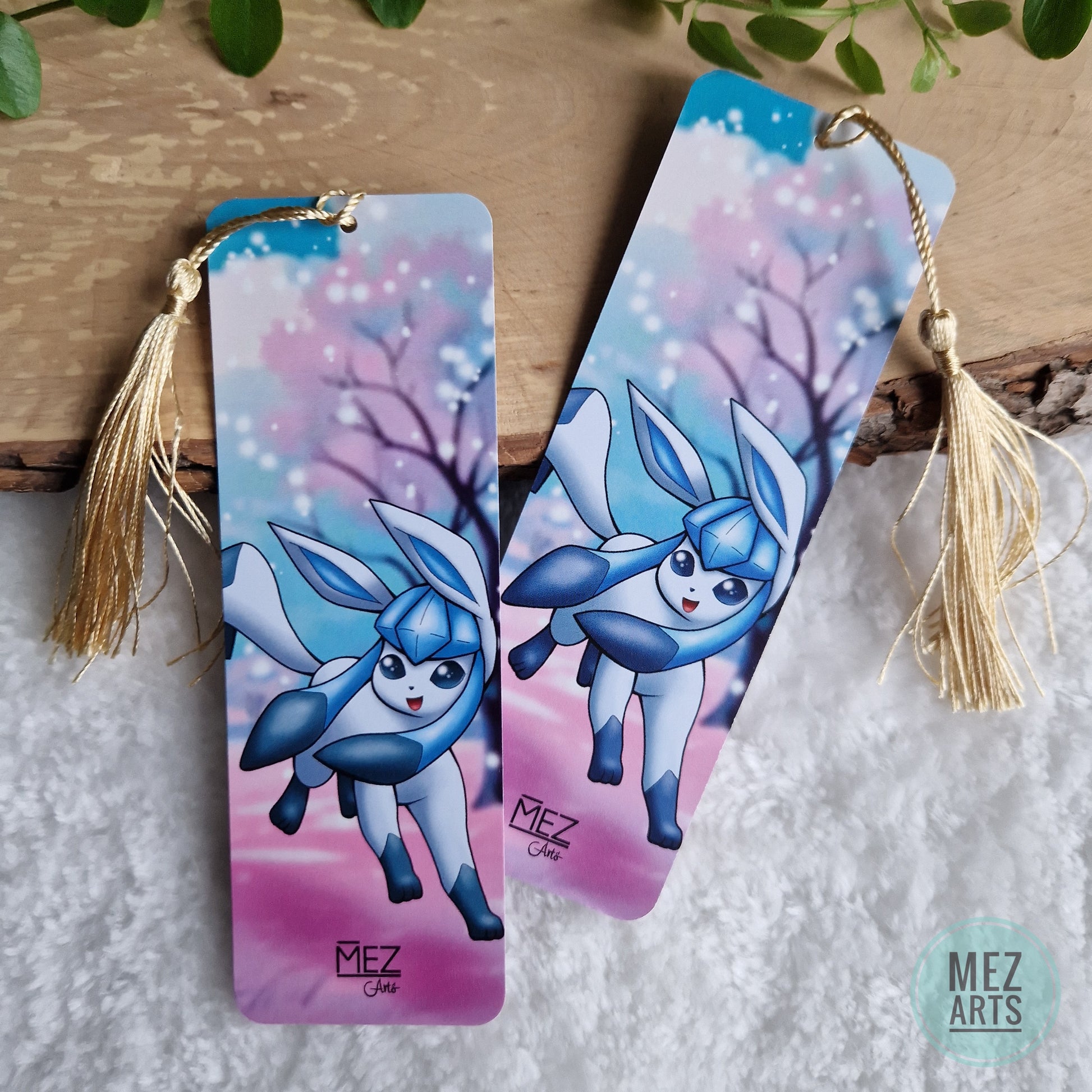Vibrant bookmark of Glaceon with tassel. It has two different sides so you can choose which design you want to use today while reading your book!