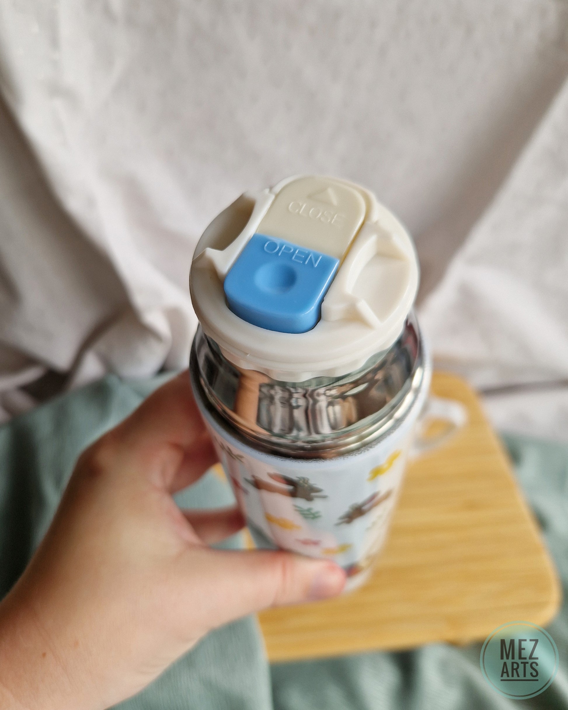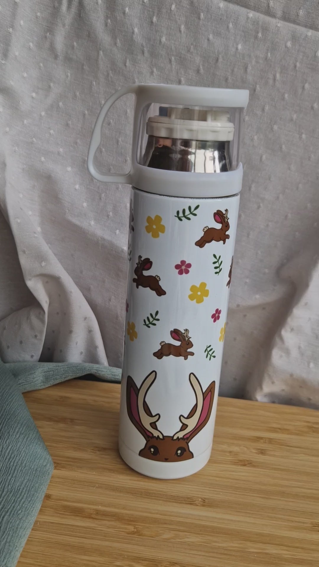 Colourful steel thermos with a cute, vibrant print! To keep your tea hot and iced coffee cold! The lid is a cup to go as well!