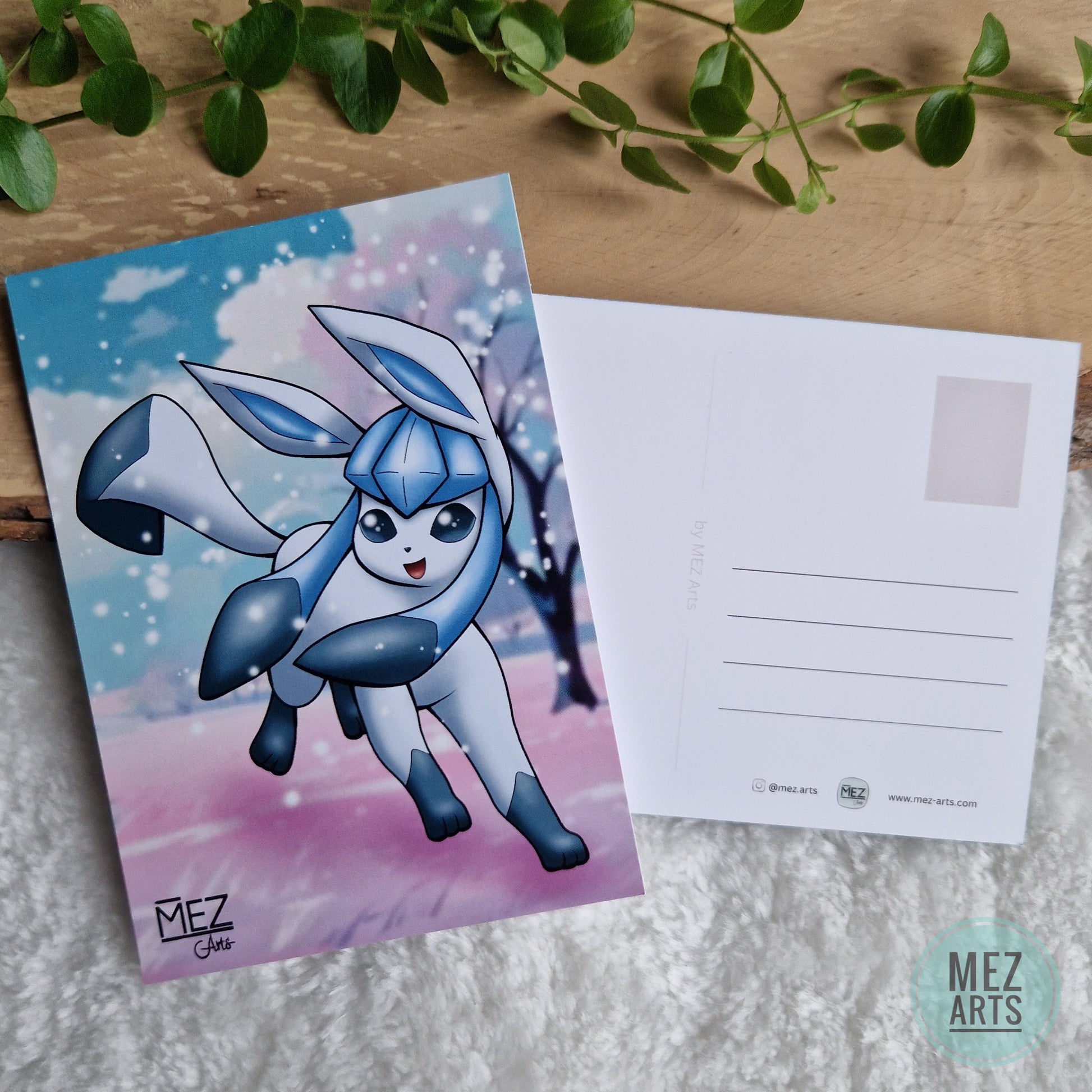 Vibrant postcard of Glaceon! Use the back to write your message and you can send it as is, or use an envelope. Perfect gift for friends, or just keep it for yourself as an art print!