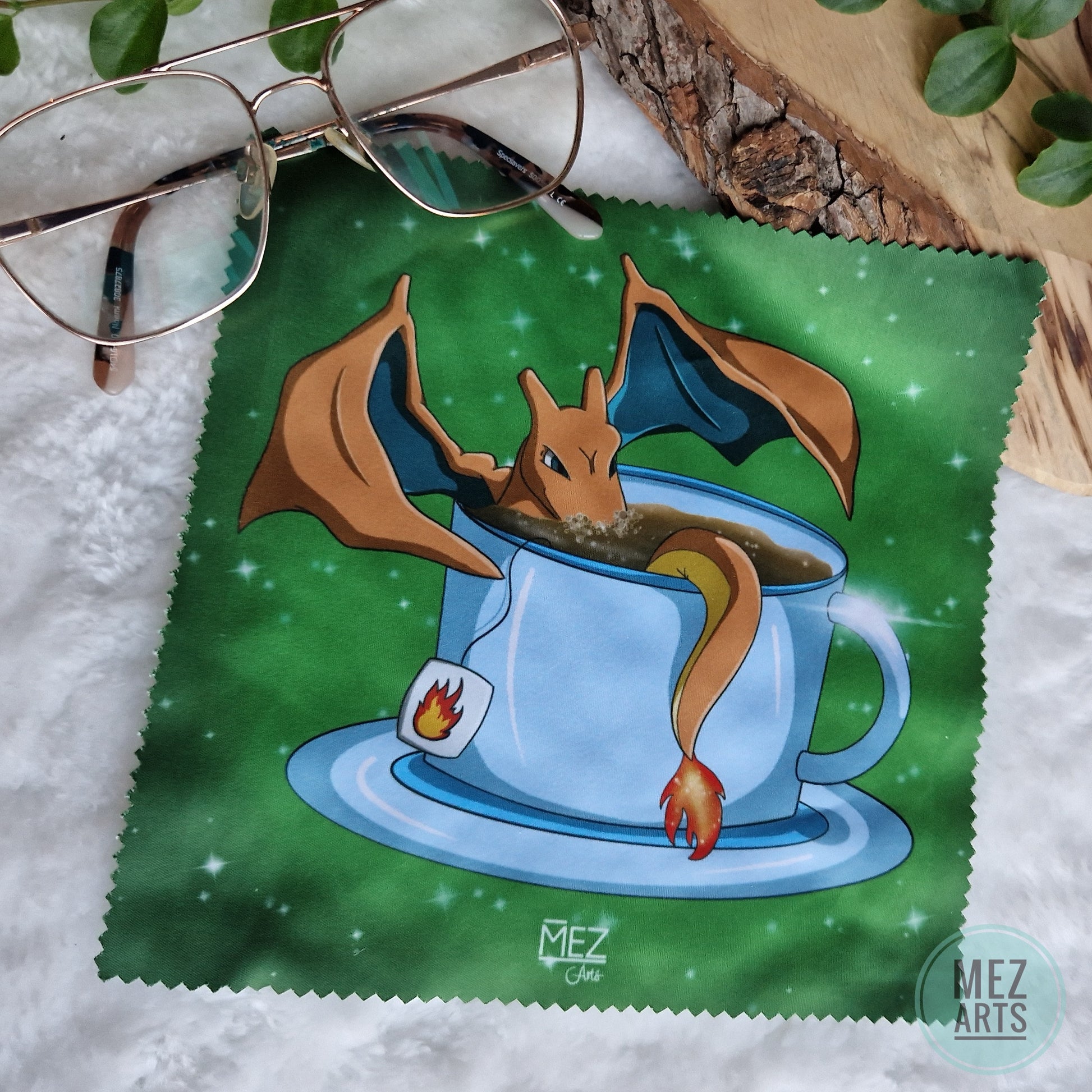 Clean your glasses, phone or tablet in style with this vibrant glasses cloth of Charizard in a teacup.
