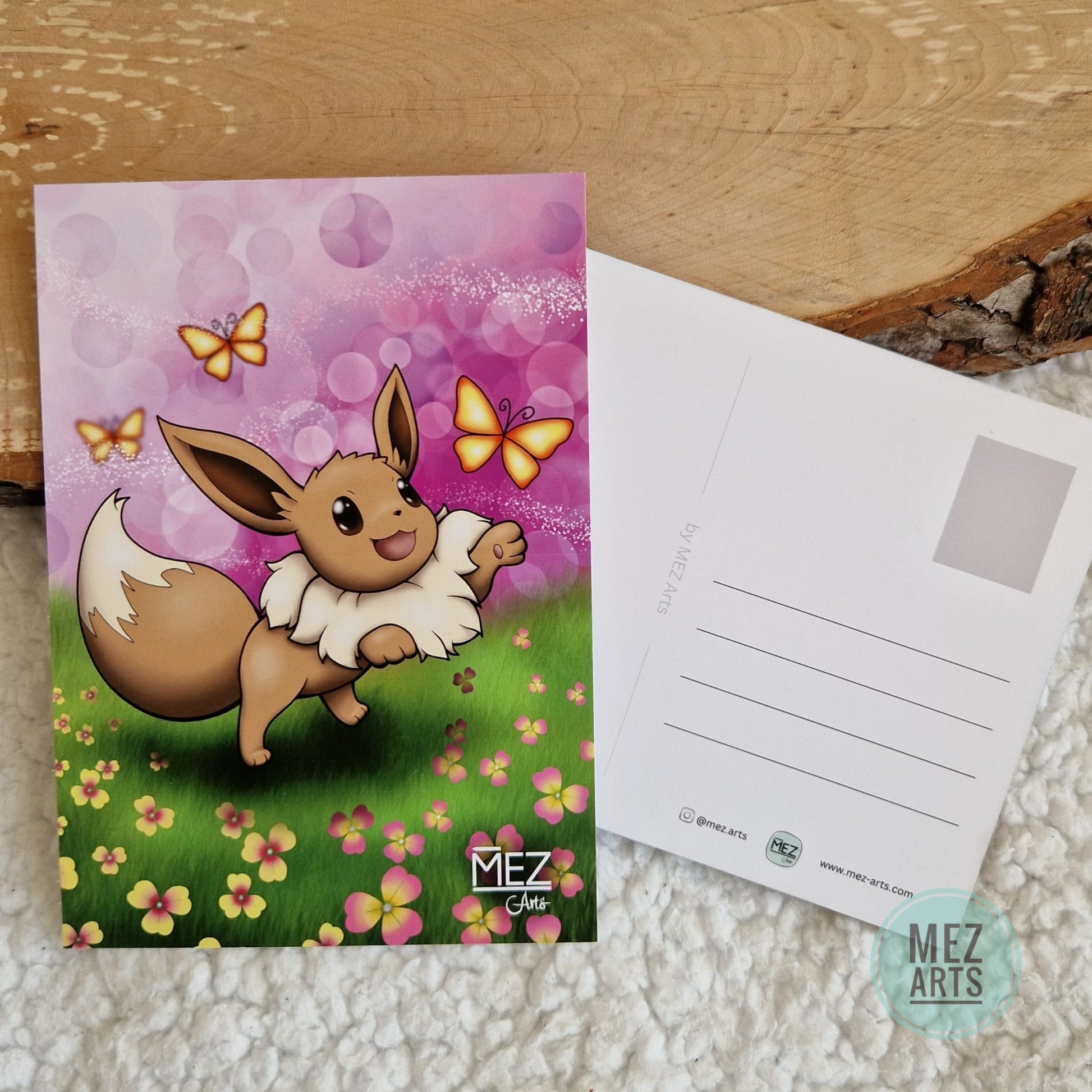 Vibrant postcard of Eevee! Use the back to write your message and you can send it as is, or use an envelope. Perfect gift for friends, or just keep it for yourself as an art print!