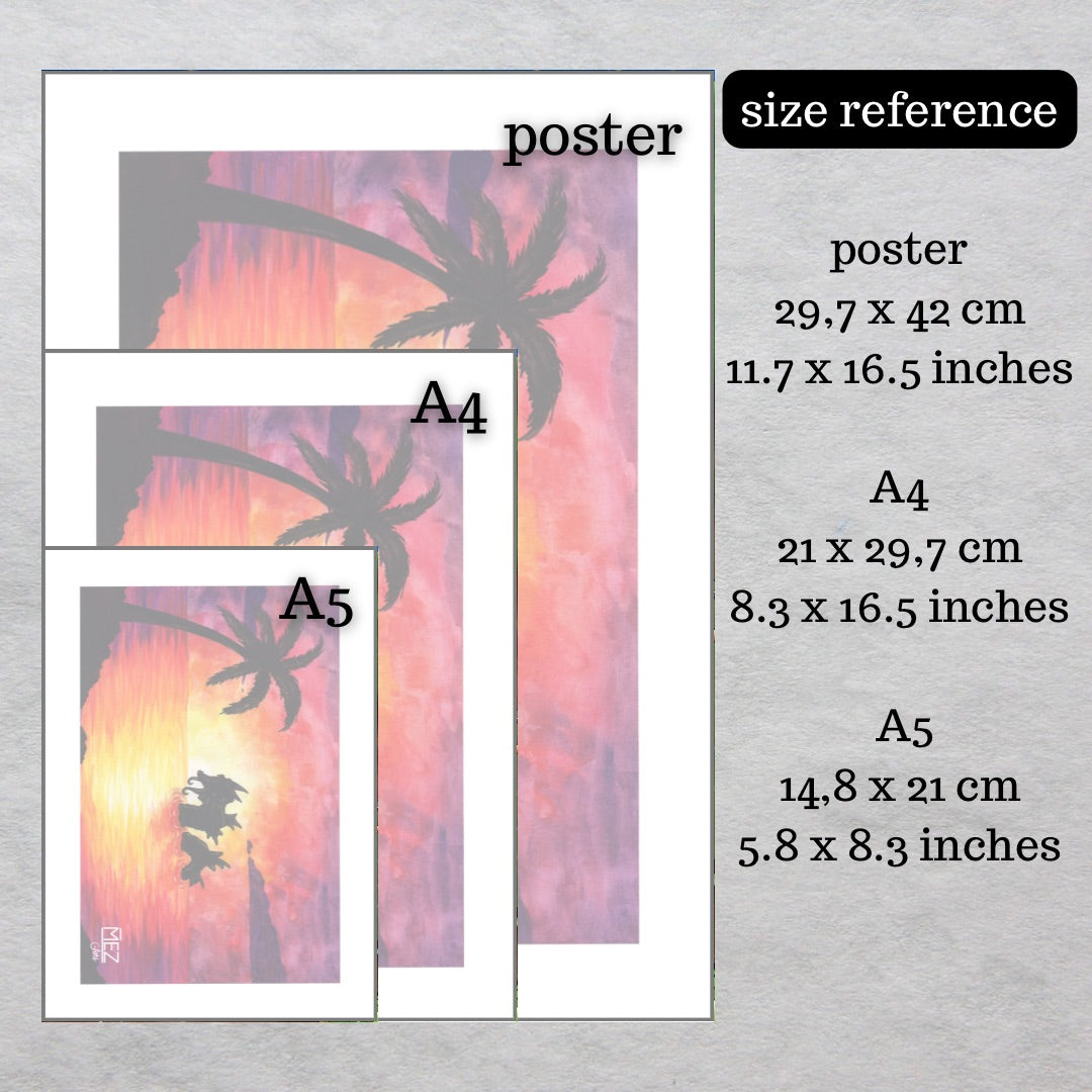 A5, A4 or poster sized, unframed. All home printed on demand on 250 grams paper with a semi-matte finish. Colours may vary because of screen settings. This is a scan of a traditional drawing, which may cause the print to be less sharp than a print of a digital drawing.