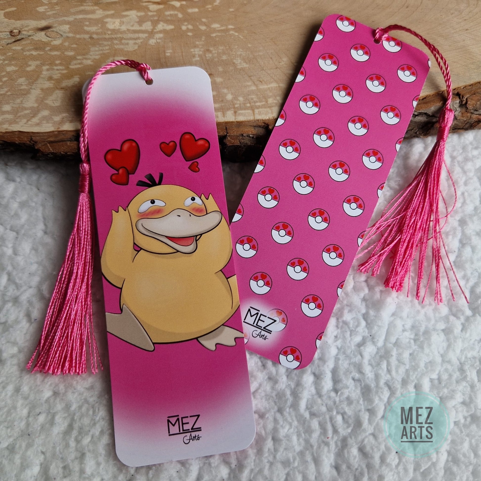Vibrant Psyduck in love bookmark with rounded corners and a tassel. It has two different sides so you can choose which design you want to use today while reading your book!