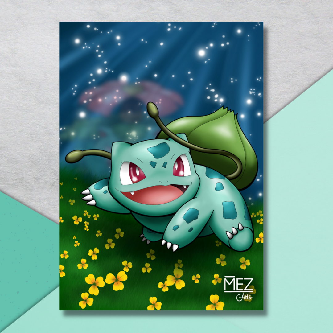 Vibrant digital drawing of the grass starter Bulbasaur.