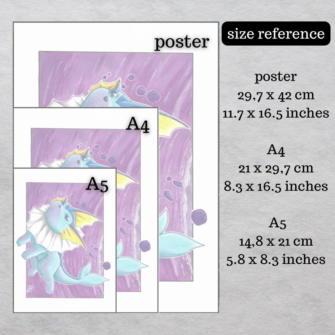 A5, A4 or poster sized, unframed. All home printed on demand on 250 grams paper with a semi-matte finish. Colours may vary because of screen settings. This is a scan of a traditional drawing, which may cause the print to be less sharp than a print of a digital drawing.