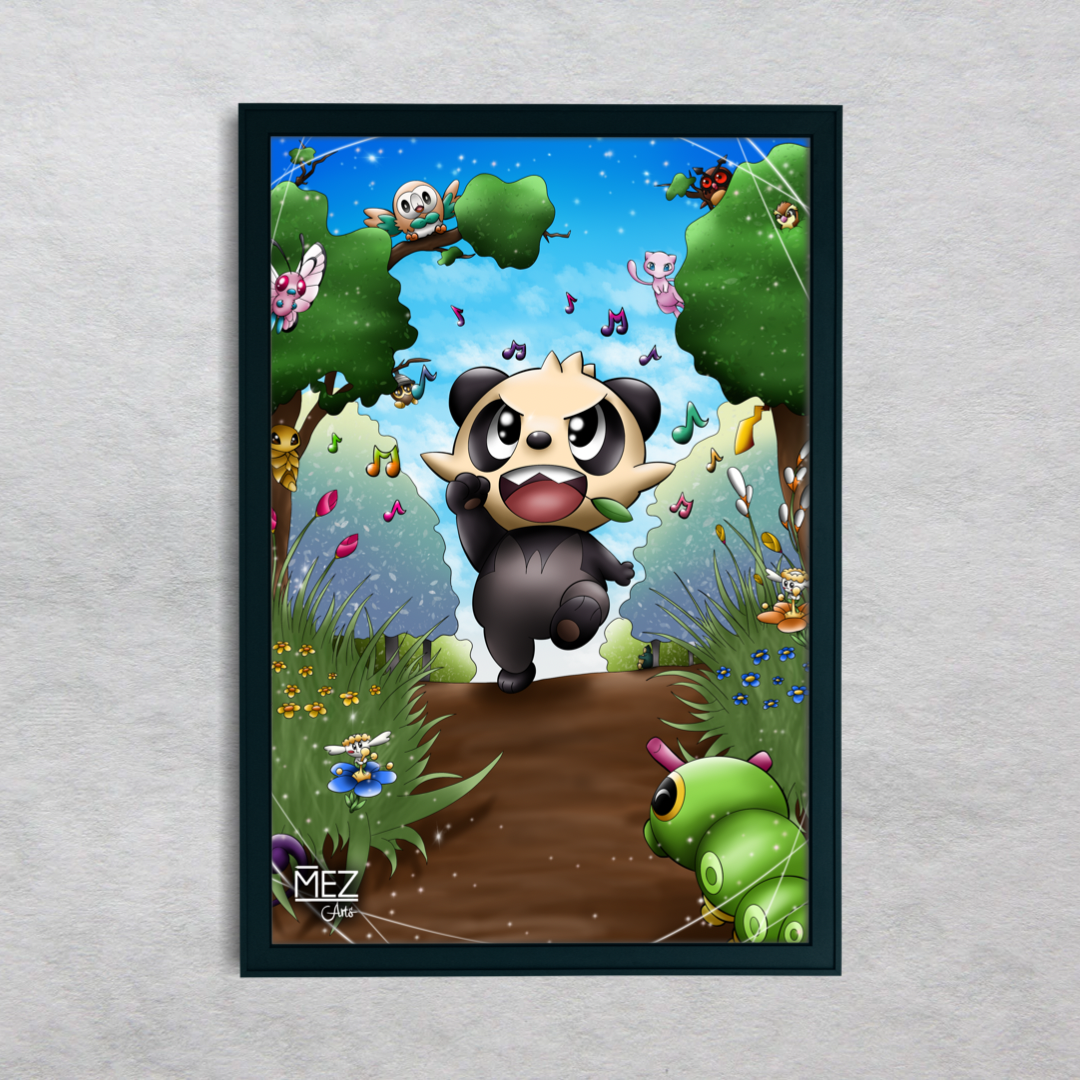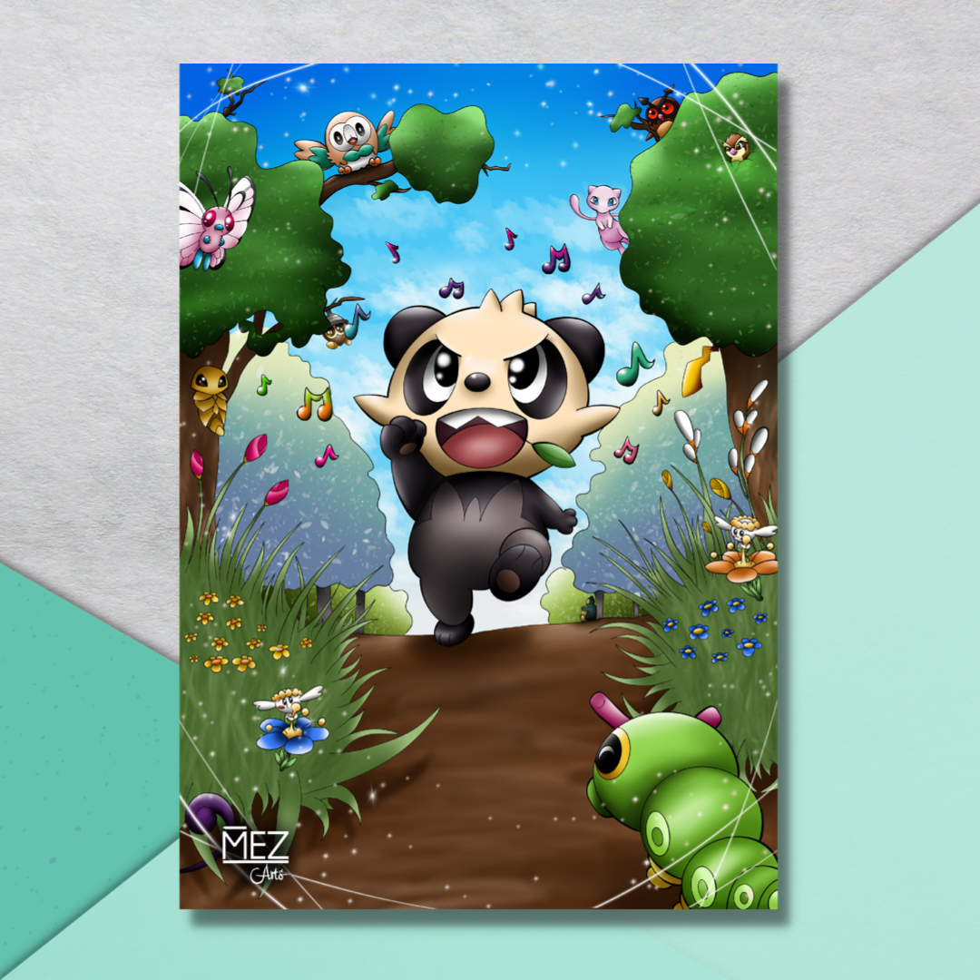 Vibrant digital drawing of Pancham with friends such as Butterfree, Caterpie, Snorlax, Mew and more!