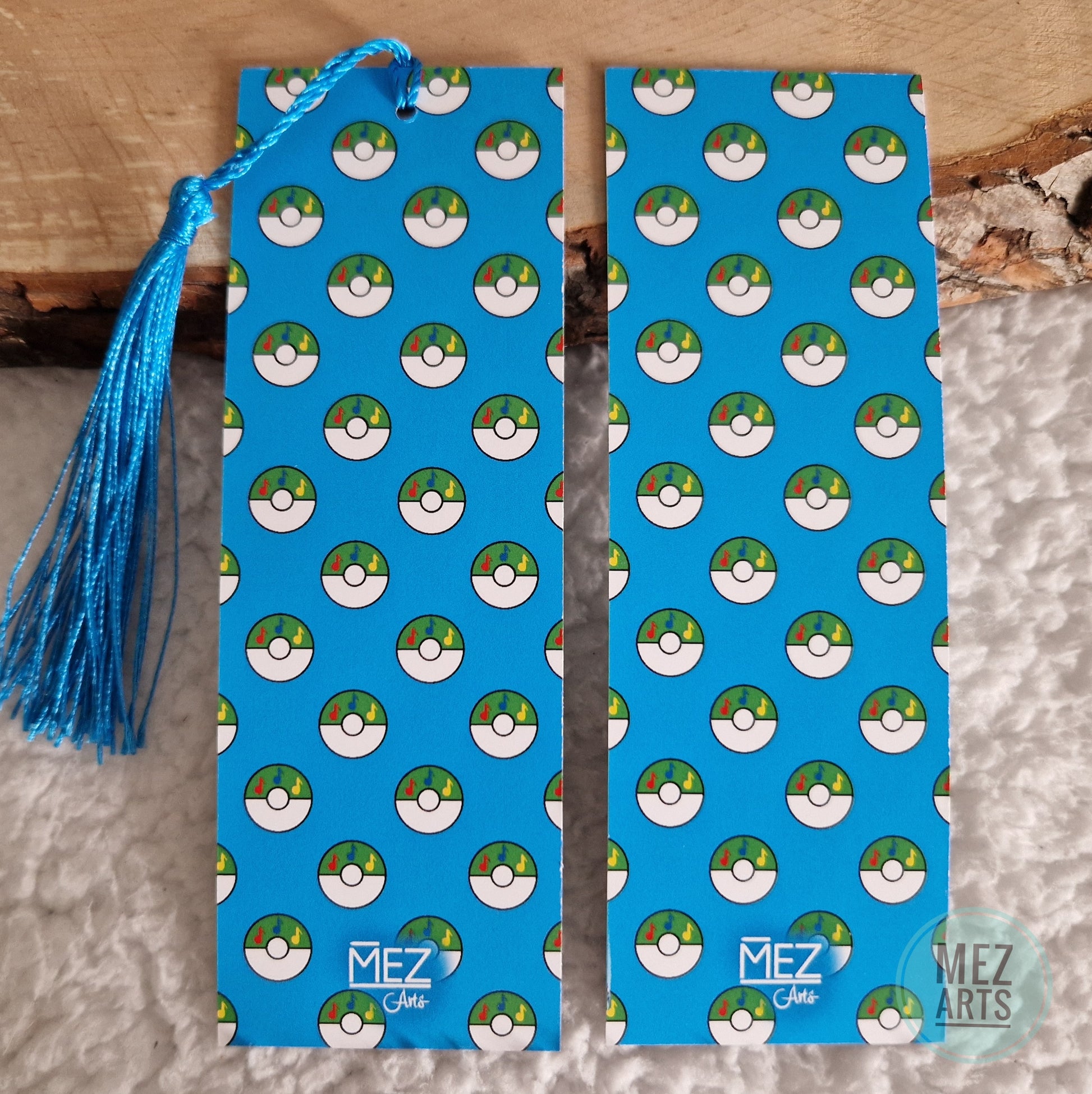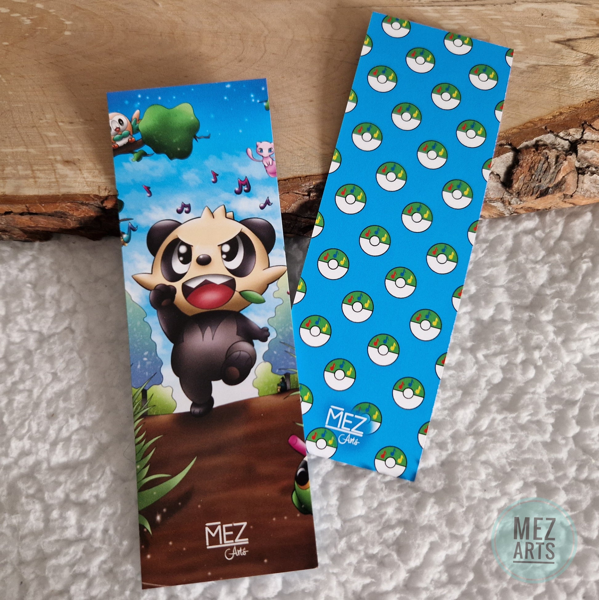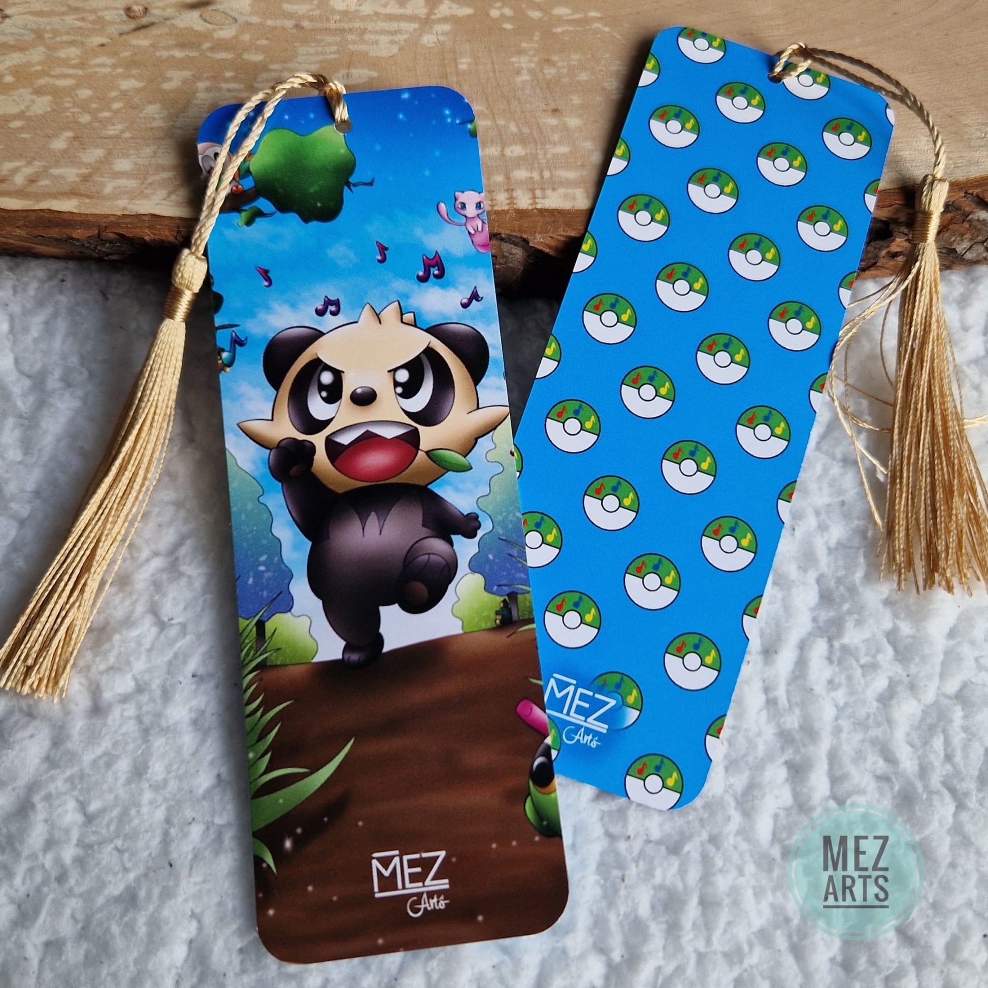 Vibrant Pancham with friends such as Rowlet, Mew and Caterpie bookmark with or without tassel. It has two different sides so you can choose which design you want to use today while reading your book!