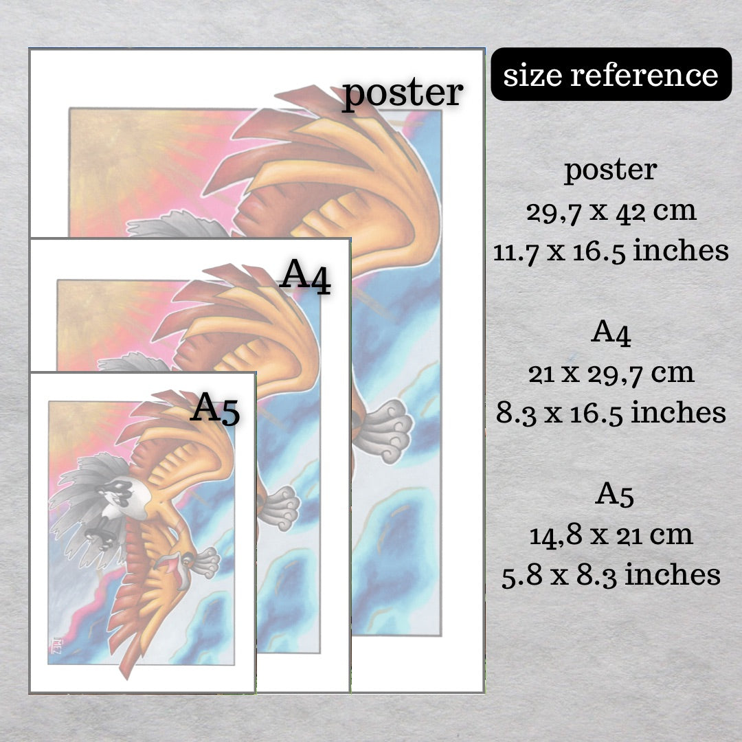 A5, A4 or poster sized, unframed. All home printed on demand on 250 grams paper with a semi-matte finish. Colours may vary because of screen settings. This is a scan of a traditional drawing, which may cause the print to be less sharp than a print of a digital drawing.