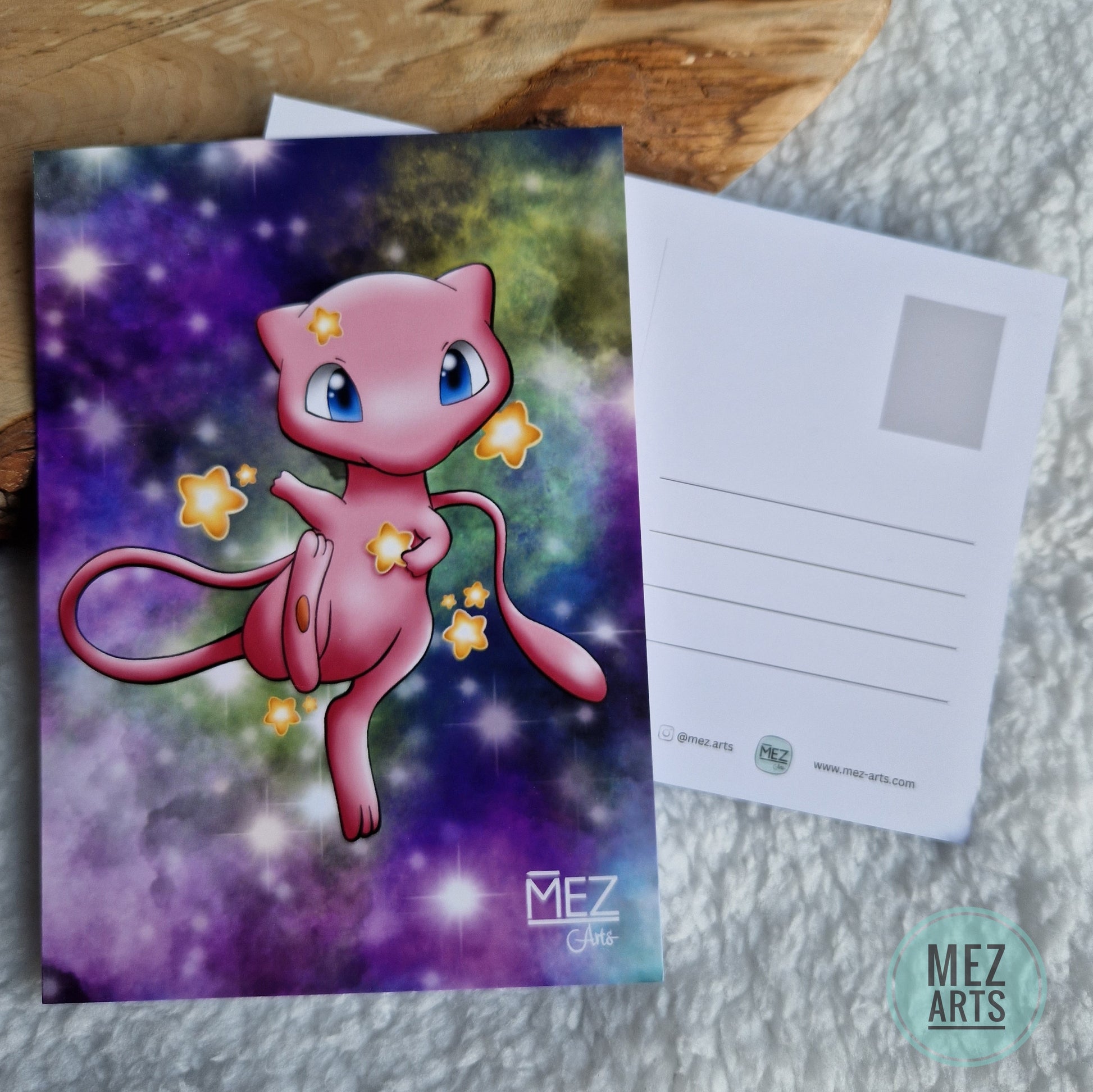 Vibrant postcard of Mew! Use the back to write your message and you can send it as is, or use an envelope. Perfect gift for friends, or just keep it for yourself as an art print!