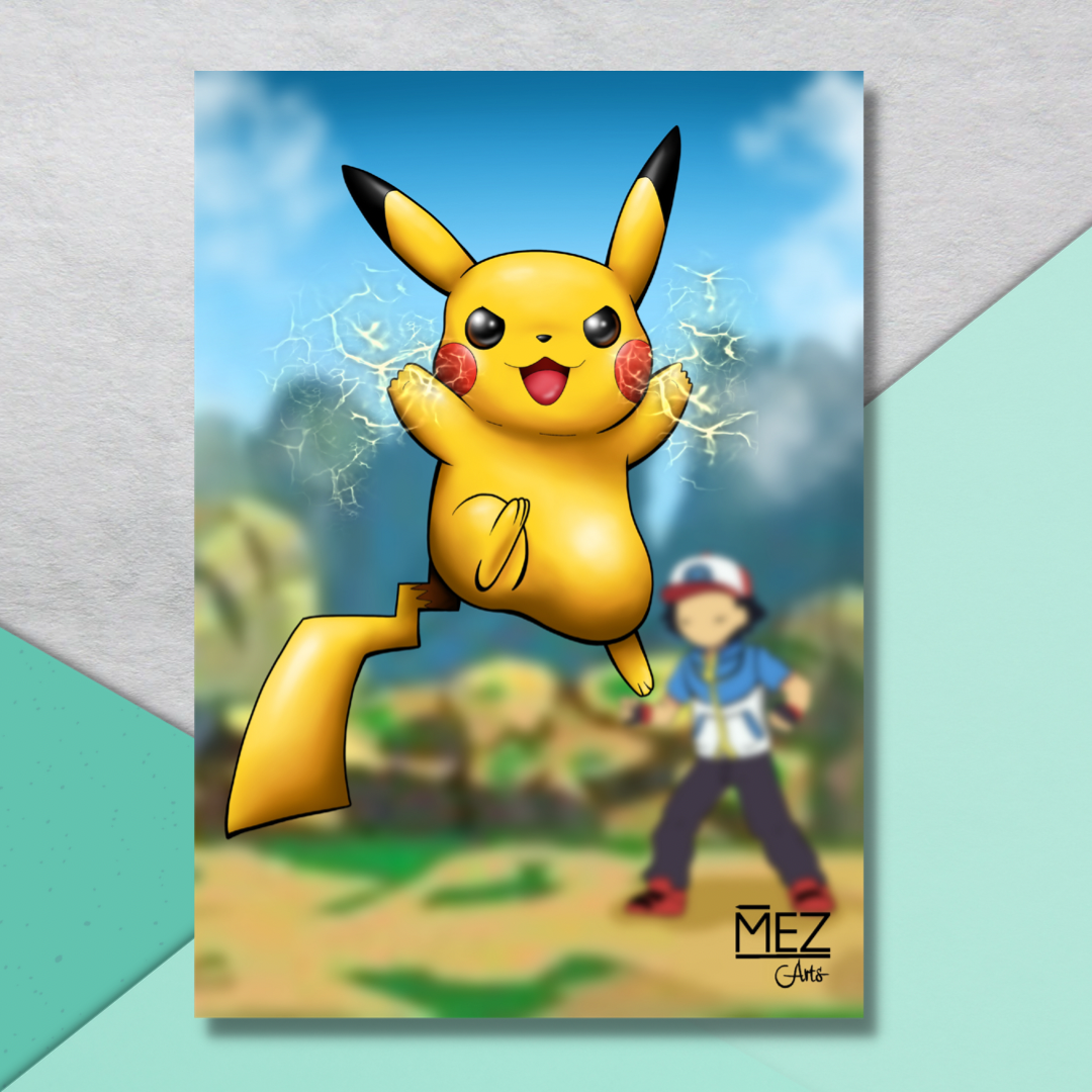Vibrant digital drawing of the populair electric mouse Pikachu.