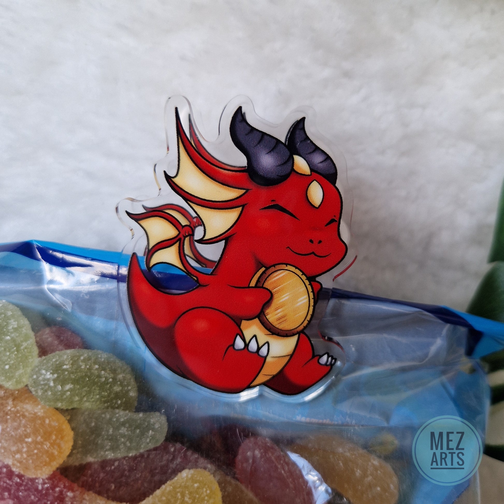 Let this cute Treasure Dragon hoard your snacks, and keep them fresh! Or use it as an accessory on your shirt, binder, notebook or whatever you want!
