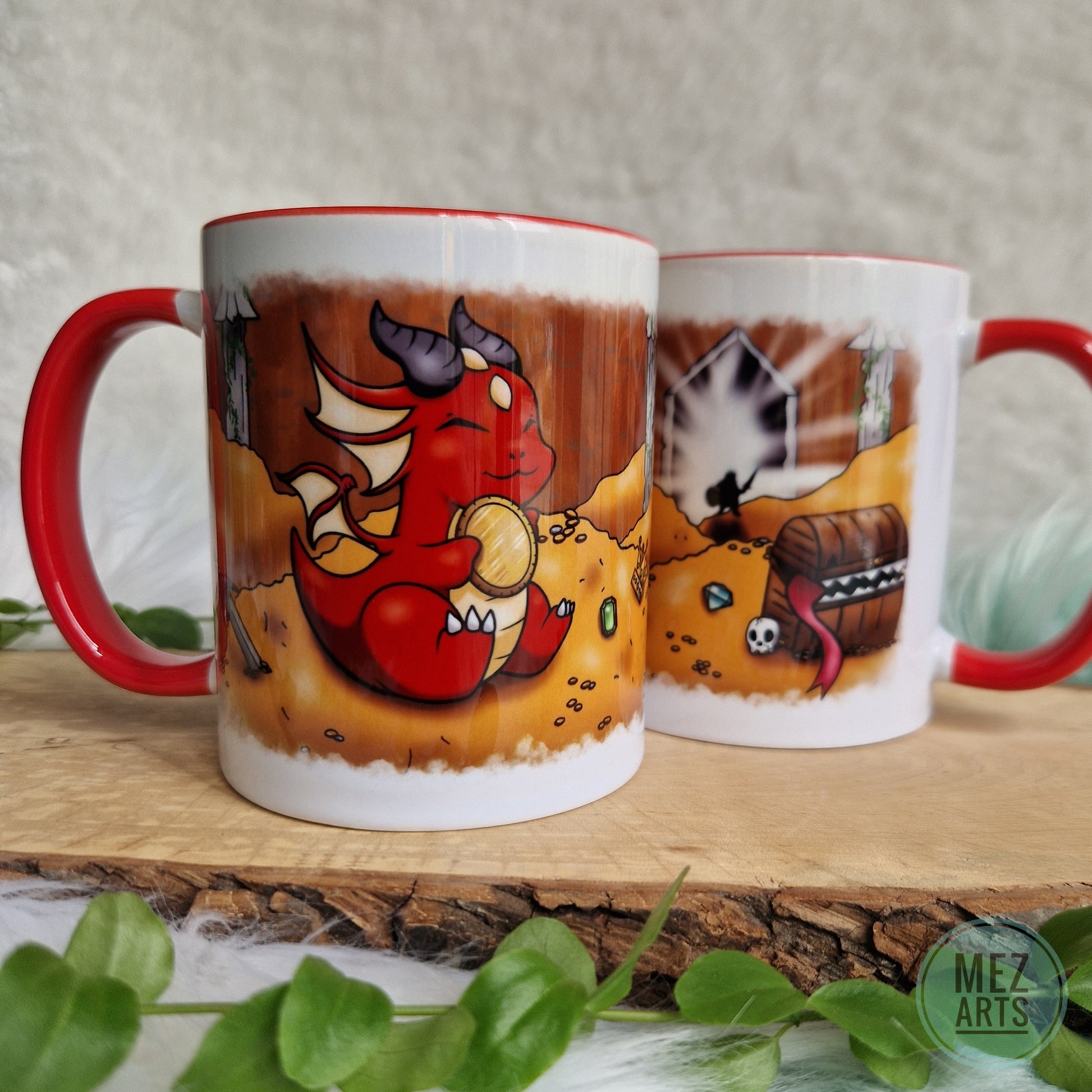 Colourful ceramic mug with a cute red Dragon enjoying its treasure!
